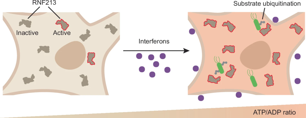 - Cellular ATP levels, increased by interferons, reversibly regulate RNF213 E3 ligase activity in living cells.
